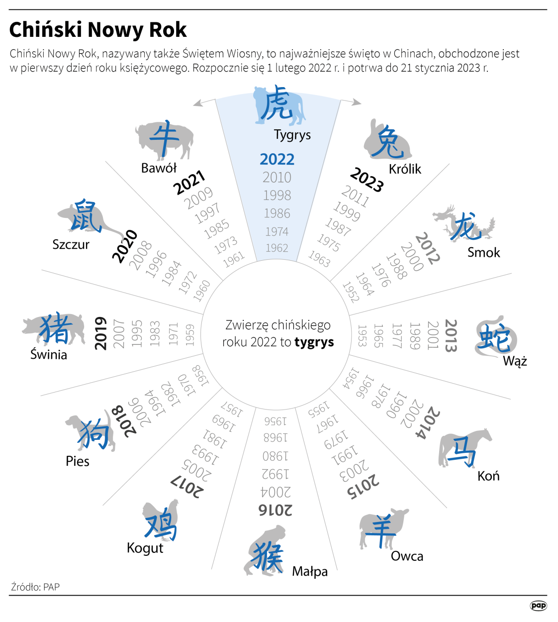 Chiński Nowy Rok, nazywany także Świętem Wiosny, to najważniejsze święto w Chinach, obchodzone jest w pierwszy dzień roku księżycowego. Rozpocznie się 1 lutego 2022 r. i potrwa do 21 stycznia 2023 r.