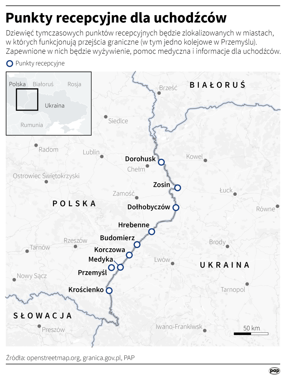 Wyjaśnił, że w punktach recepcyjnych zapewnione będzie wyżywienie, możliwość odpoczynku, pomoc medyczna i informacje dla uchodźców. "Równocześnie jest to miejsce w którym będzie następować przekierowanie osób - które nie mają zabezpieczonego miejsca pobytu na terenie naszego kraju – do miejsca zakwaterowania zbiorowego" – przekazał wojewoda lubelski. (PAP)