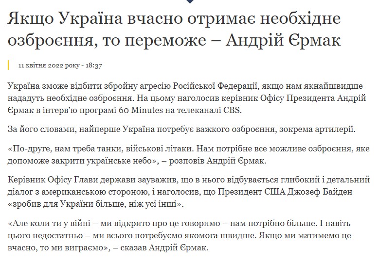 23:17 Ukraina jest w stanie odeprzeć zbrojną agresję ze strony Federacji Rosyjskiej, ale potrzebuje więcej broni - ocenił szef biura (administracji) ukraińskiego prezydenta Andrij Jermak w opublikowanym oświadczeniu.