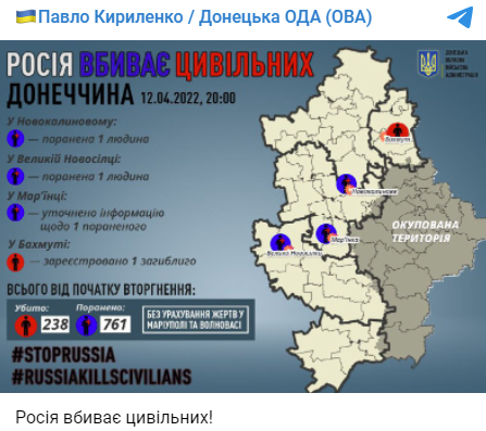 Jak podano, "w nocy na 12 kwietnia pociskami fosforowymi ostrzelana została wieś Nowojakowliwka". W wyniku ostrzału uszkodzone zostały budynki. "Dzięki deszczowej pogodzie nie doszło do pożaru. Nie ma zabitych i rannych" - głosi komunikat.