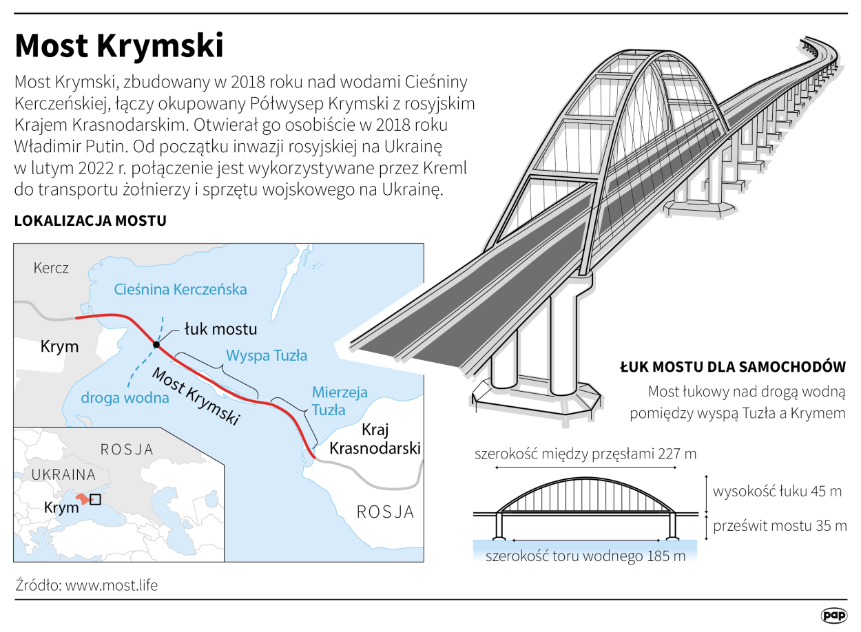 Wybudowany w 2018 roku za co najmniej 3,6 mld dolarów Most Kerczeński, zwany również Mostem Krymskim, to ważny obiekt strategiczny, bo łączy Krym z terytorium Rosji. Przede wszystkim jest to ważny dla Kremla symbol aneksji – powiedział w sobotę PAP analityk wojskowy Mariusz Cielma.