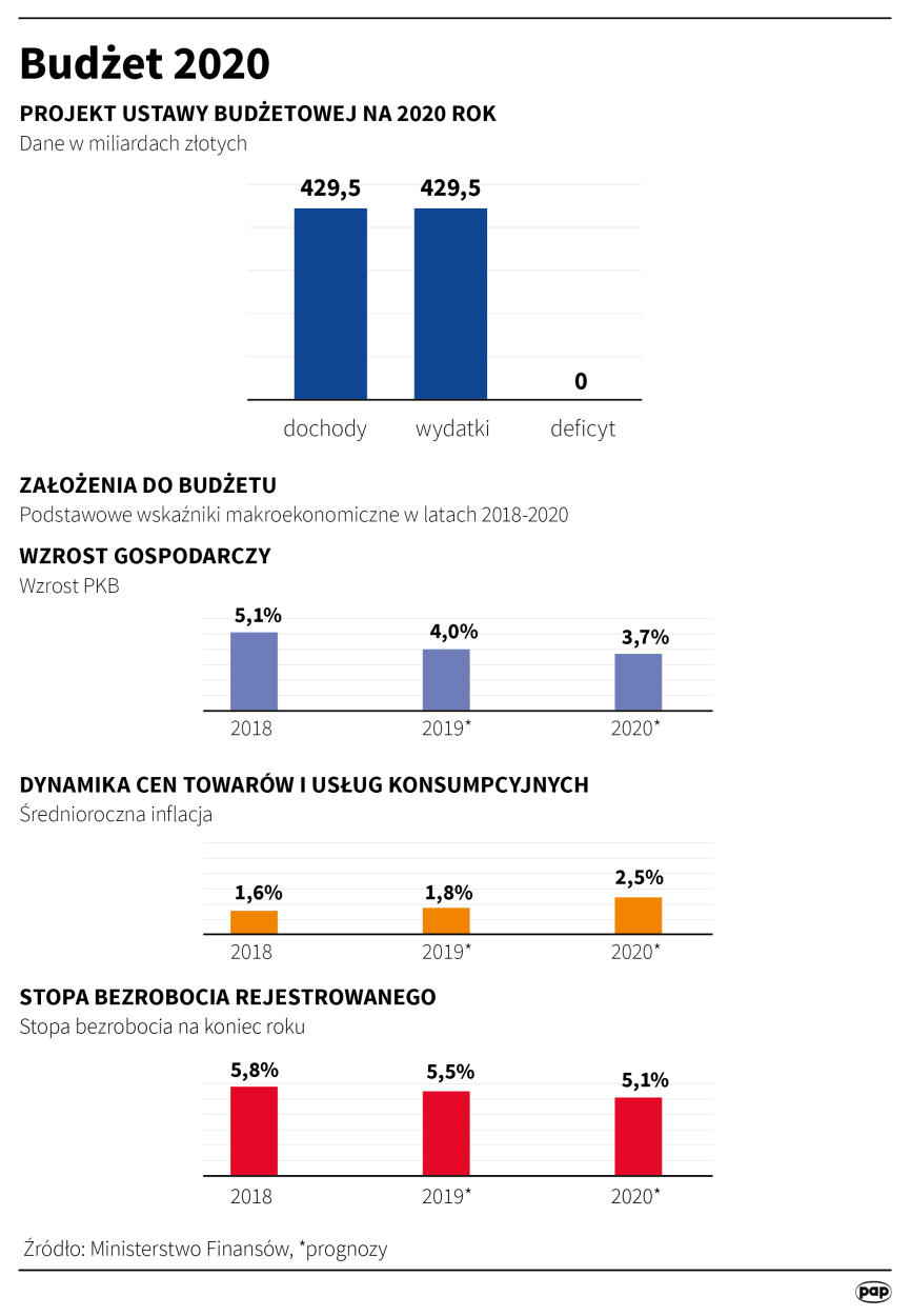 Projekt budżetu na 2020 r. bez deficytu, wydatki i dochody po 429,5 mld zł