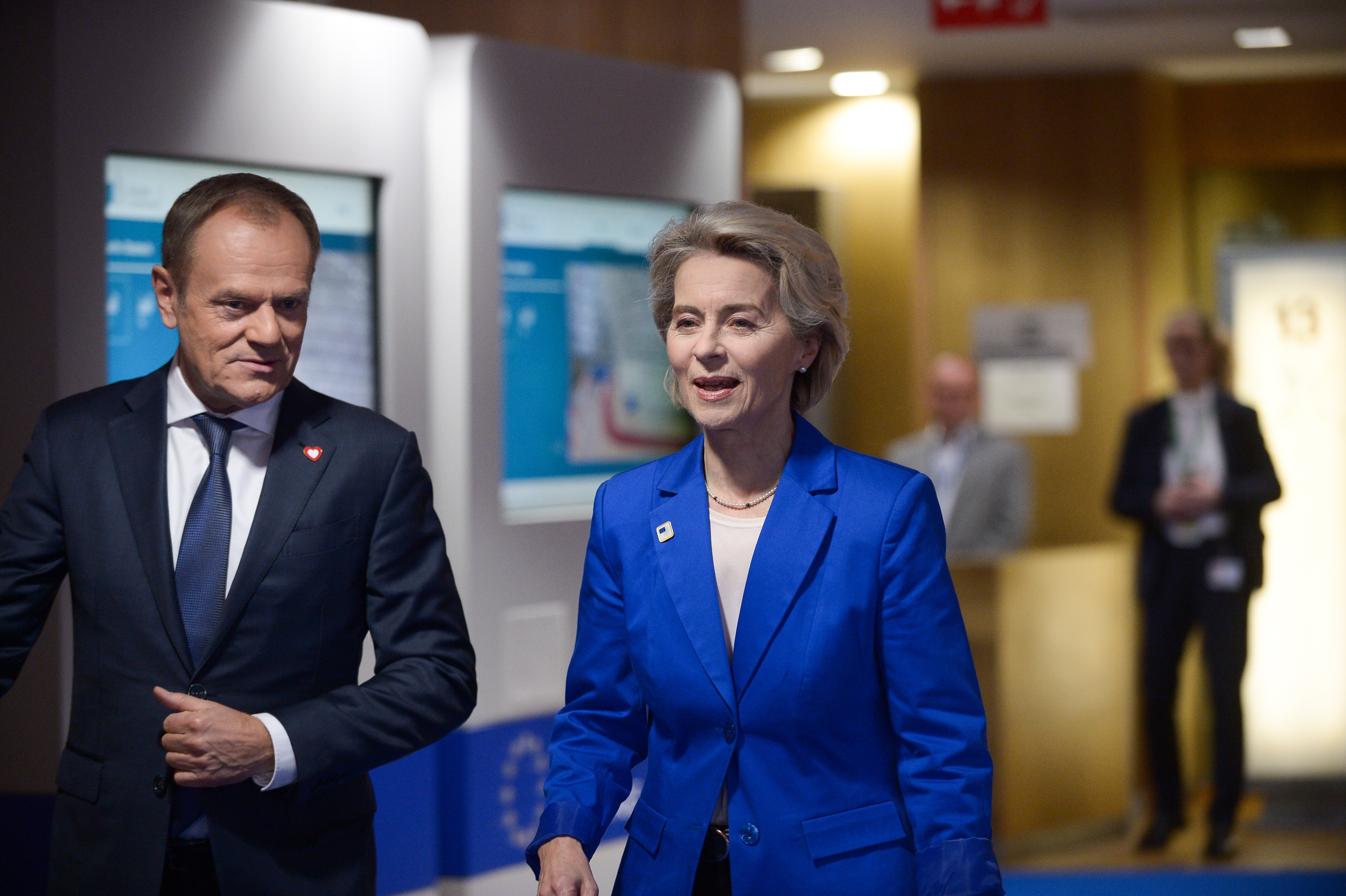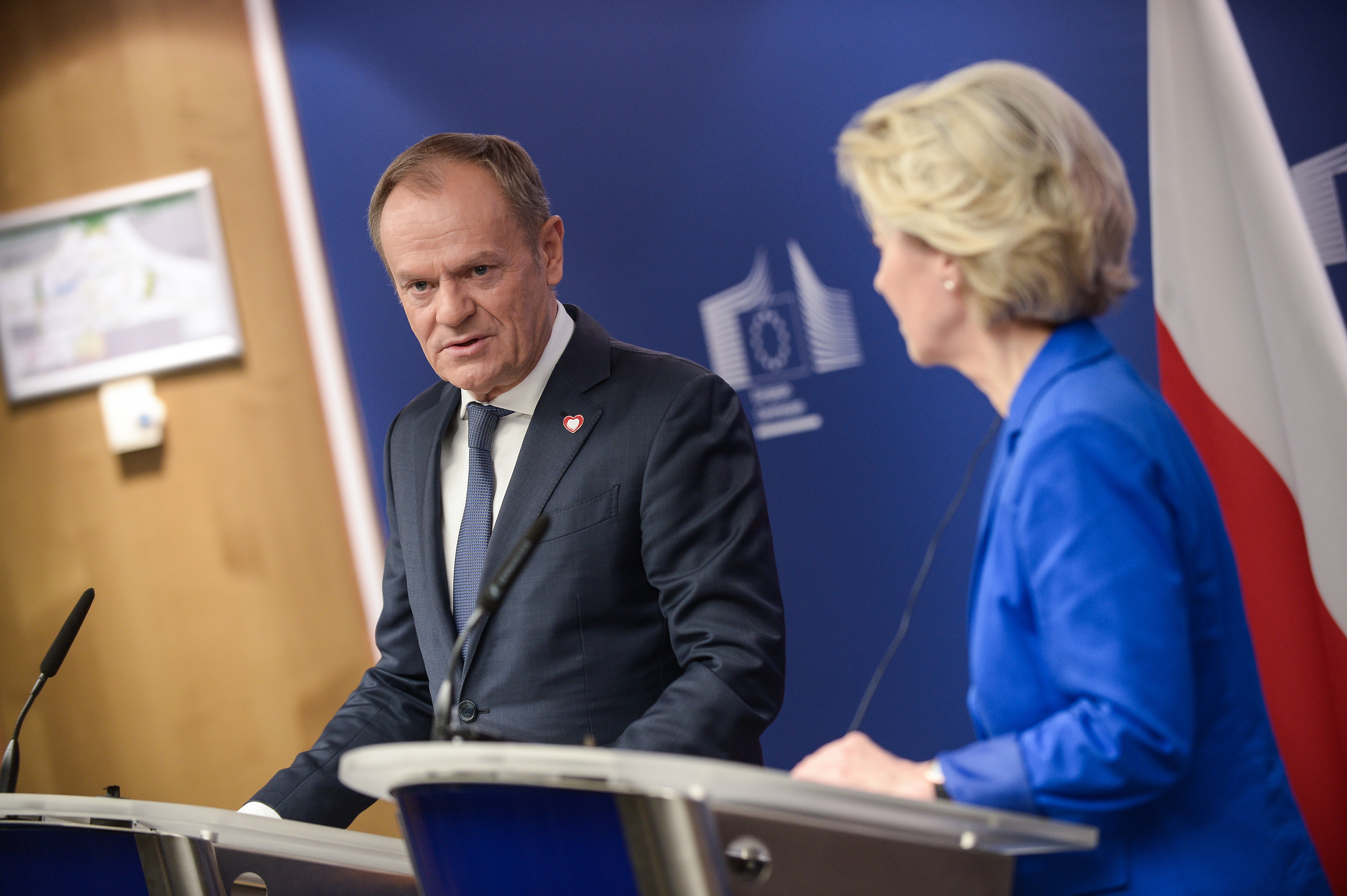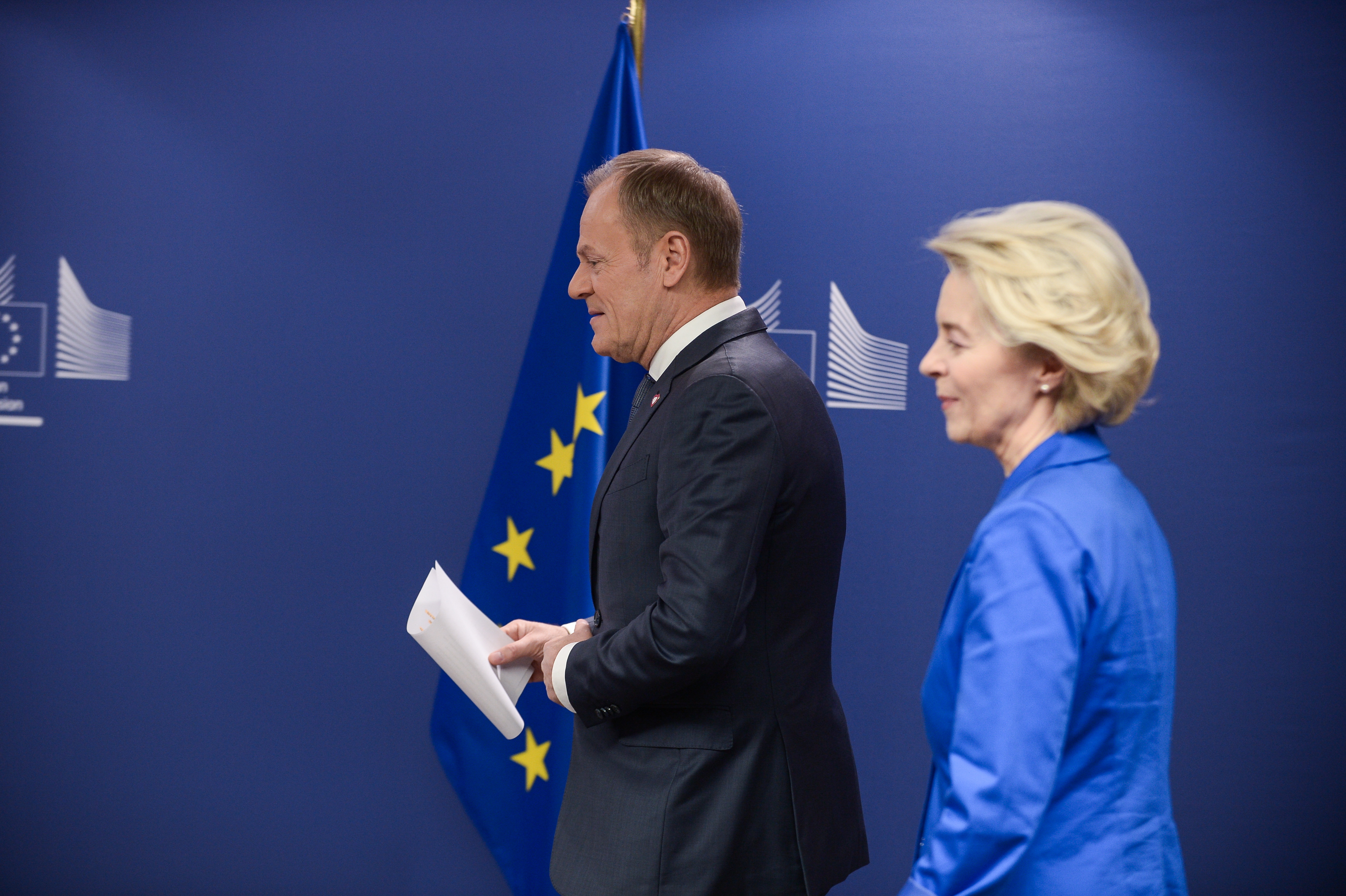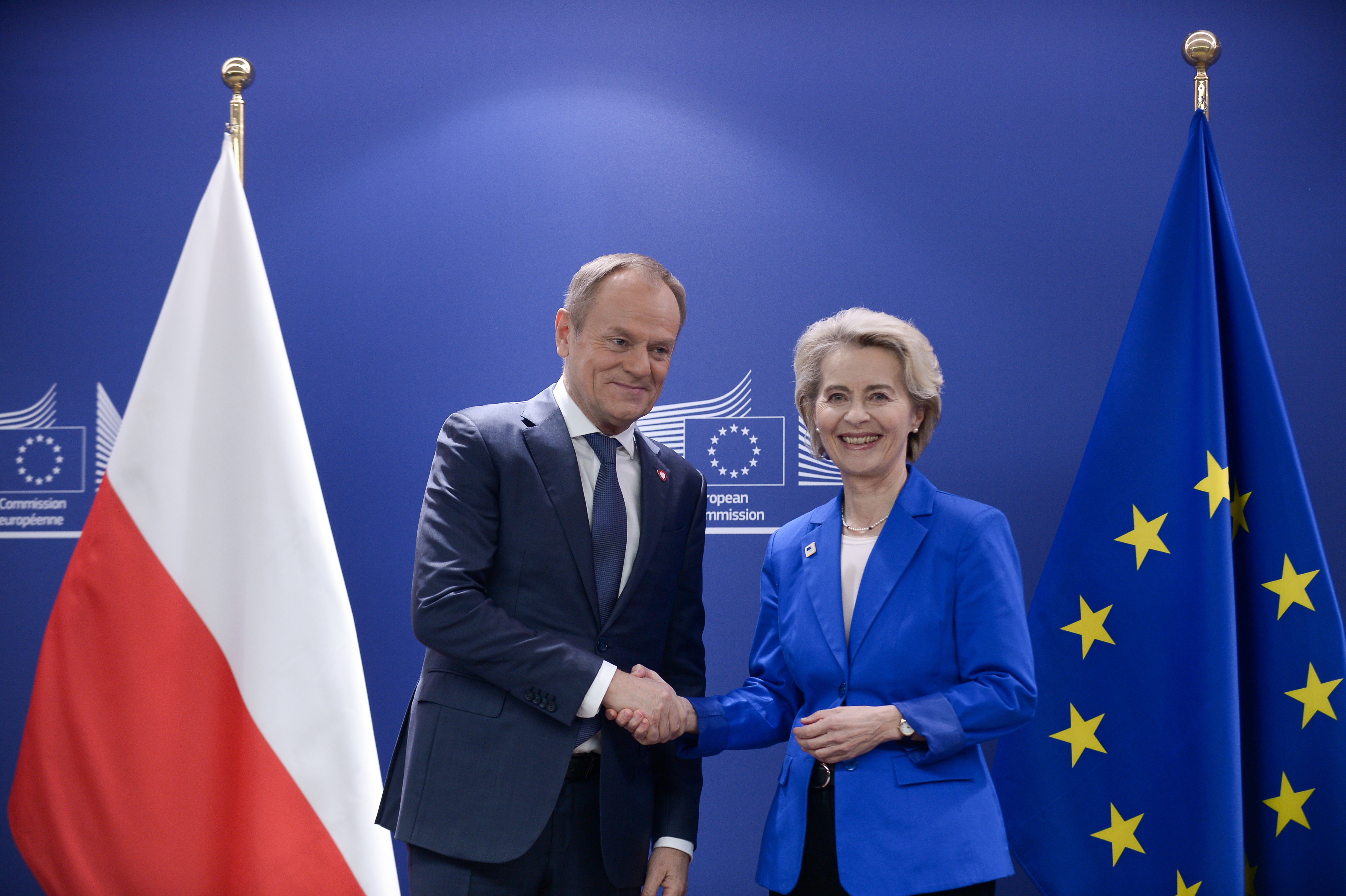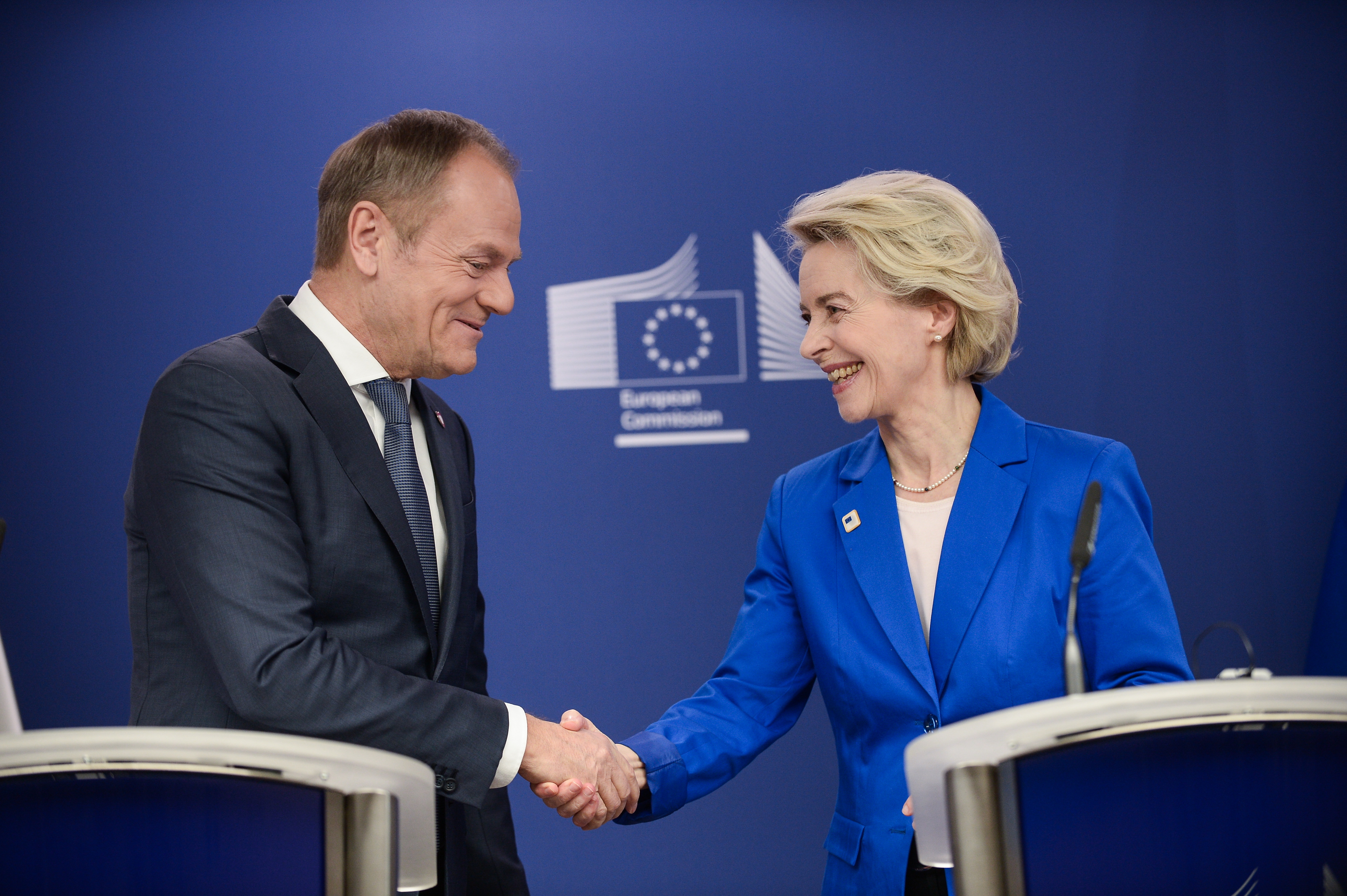 "Każdy, kto zna realia europejskie i nasze polskie wie, że dawno nie mieliśmy w Brukseli tak lojalnego i serdecznego sojusznika polskich spraw, jak pani przewodnicząca KE" - powiedział premier Donald Tusk do von der Leyen.