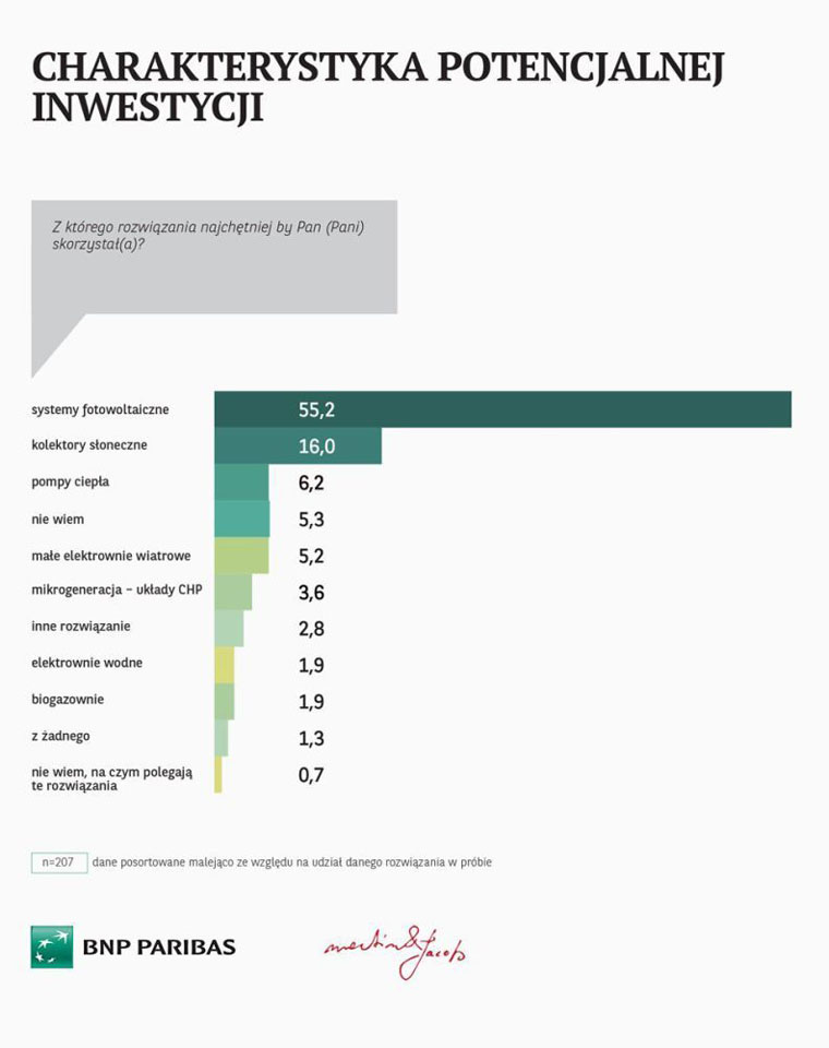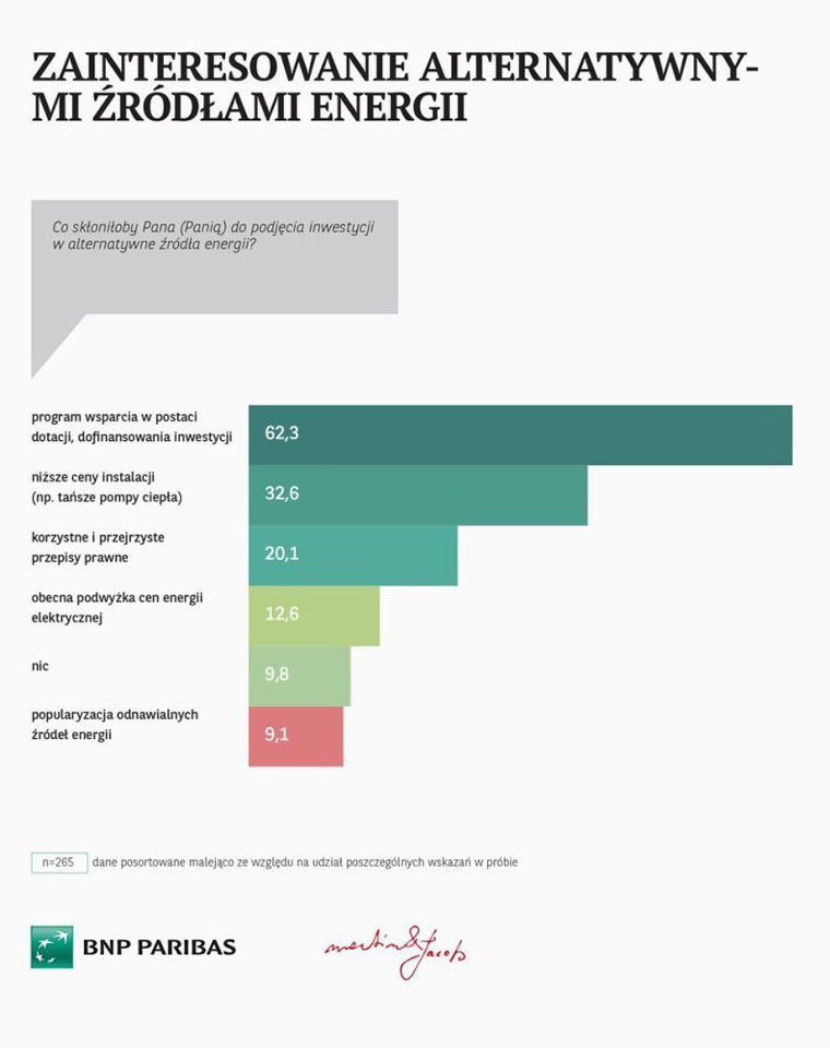Zdaniem 62,3 proc. badanych - do podjęcia inwestycji w OZE skłoniłby ich program wsparcia w postaci dotacji lub dofinansowania. „Rolnicy w większości przypadków oczekują wsparcia finansowego takiej inwestycji w postaci programu lub zwykłego dofinansowania. Zdają sobie jednocześnie sprawę z kosztów jakie generuje taka inwestycja. Na obniżenie kosztów instalacji oczekuje bowiem grupa dwukrotnie mniejsza, niż grupa oczekująca dofinansowania. Ponadto, to dobry moment, aby rozmawiać o takich rozwiązaniach w kontekście nowego Programu Rozwoju Obszarów Wiejskich, czy pomocy krajowej” – dodaje Maciej Piskorski.