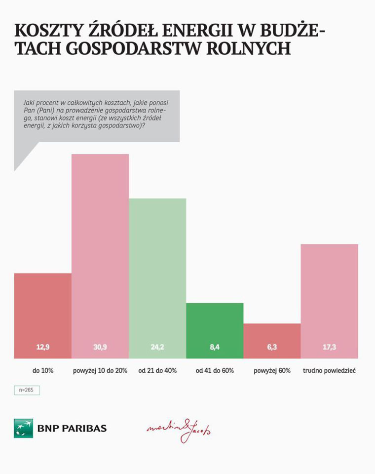 Głównym źródłem energii wykorzystywanym przez gospodarstwa rolne jest prąd. Jak wynika z badania „Energia elektryczna w gospodarstwie” przeprowadzonego przez Martin & Jacob na zlecenie Banku BNP Paribas. Jeżeli prąd podrożeje, rolnicy będą skłonni rozważyć alternatywne źródła energii.