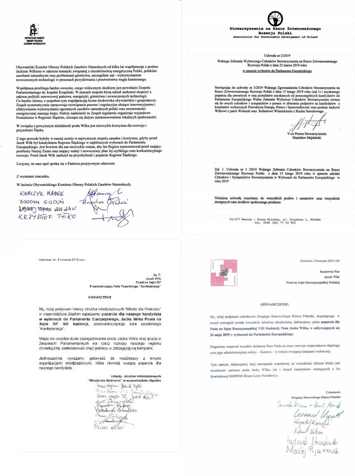 Oświadczenie o poparciu wyrazili również śląscy liderzy Stowarzyszenia Młodzi dla Wolności. Jak czytamy w oświadczeniu „[…] mając na uwadze duże zaangażowanie posła Jacka Wilka oraz pracę w Zespołach Parlamentarnych na rzecz rozwoju naszego regionu chcielibyśmy poprzeć Jacka Wilka”.