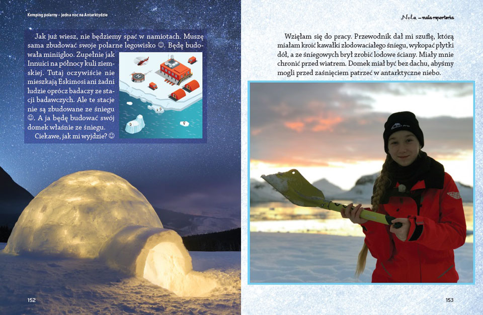 „Antarktyda to takie wielkie królestwo zwierząt zimnolubnych, szczególnie pingwinów. Na samym kontynencie mieszka ich aż pięć różnych gatunków, a kilka dodatkowych można spotkać na otaczających ją morzach. Mnie udało się zobaczyć prawie wszystkie. Te ptaki nieloty budują kolonie lęgowe, czyli takie miasta, w których są autostrady-ścieżki wydeptane między gniazdami a oceanem. To wygląda niesamowicie. Dodatkowo poznałam sekret pingwinów. Wiem, dlaczego chodząc, kołyszą się na boki. Opisałam to w mojej książce” – tłumaczy Nela.