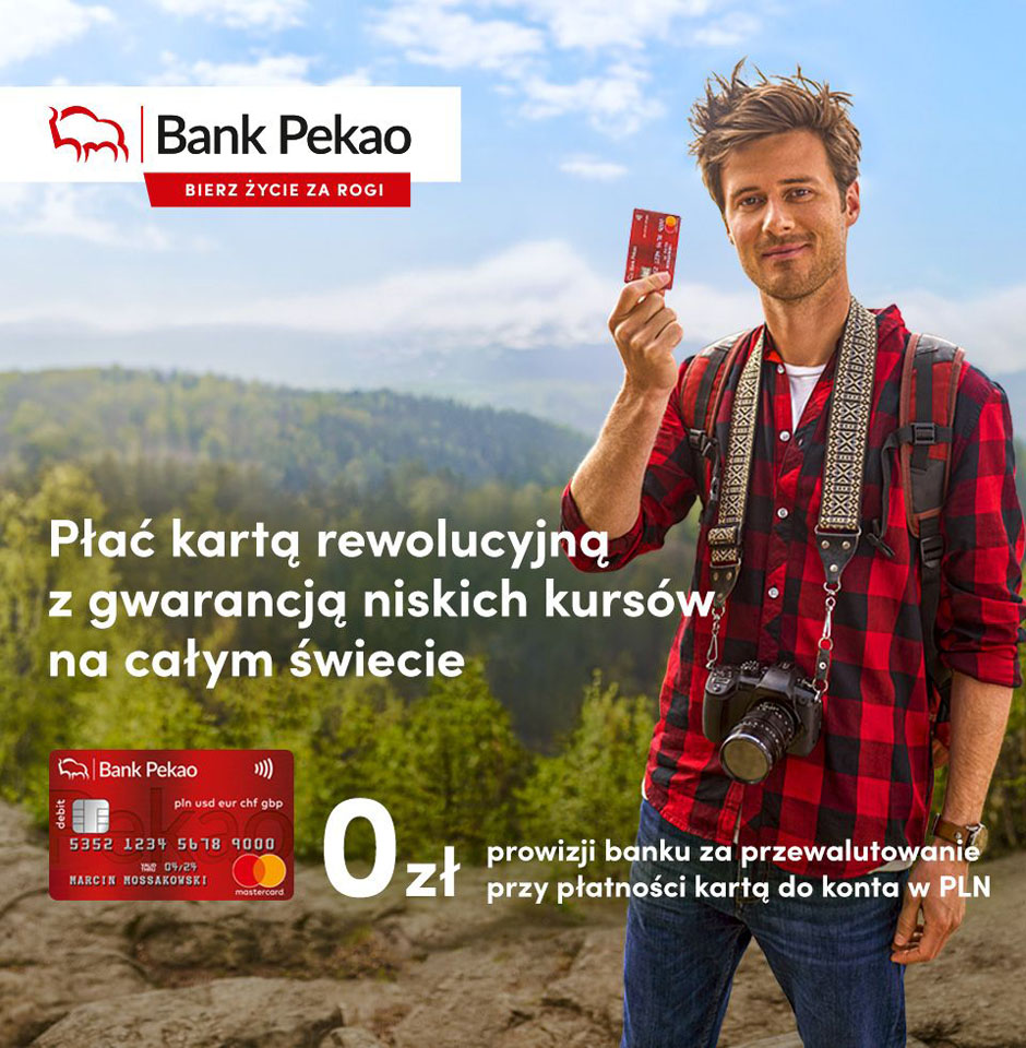 Bank Pekao S.A. promuje kartę rewolucyjną do konta, dzięki której klient banku – płacąc za granicą w sklepie lub restauracji, czy też wypłacając pieniądze z bankomatu – nie będzie obciążony przez bank żadną prowizją: ani za przewalutowanie, ani za samą operację.