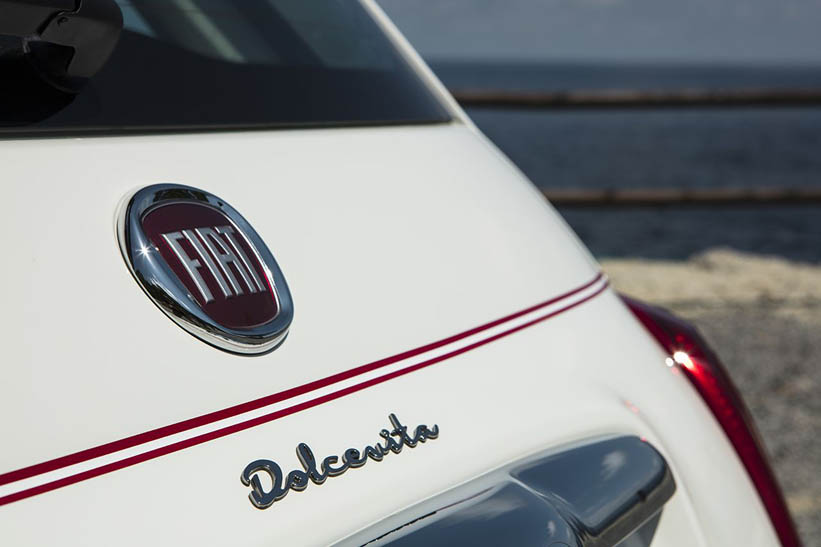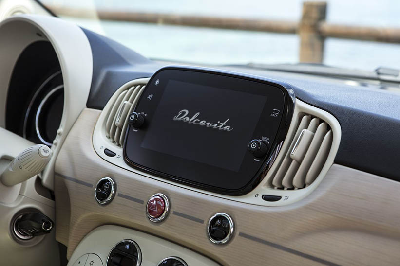 Na szczególną uwagę zasługuje wersja 500 Dolcevita kabrio. Po raz pierwszy w historii model został wyposażony w dach w poziome biało-niebieskie paski z wyszytym czerwonym logo „500” zainspirowany leżakami plażowymi i parasolami z włoskiej Riwiery lat 60. Te kolorowe pociągnięcia pędzla, przypominające biały piasek i błękit morza, powstają w procesie produkcyjnym z wykorzystaniem krosien, które jednocześnie splatają niebiesko-białe nici, aby uzyskać efekt denimu i czerwoną nić dla logo „500”, będącego ekskluzywnym podpisem tej serii specjalnej.