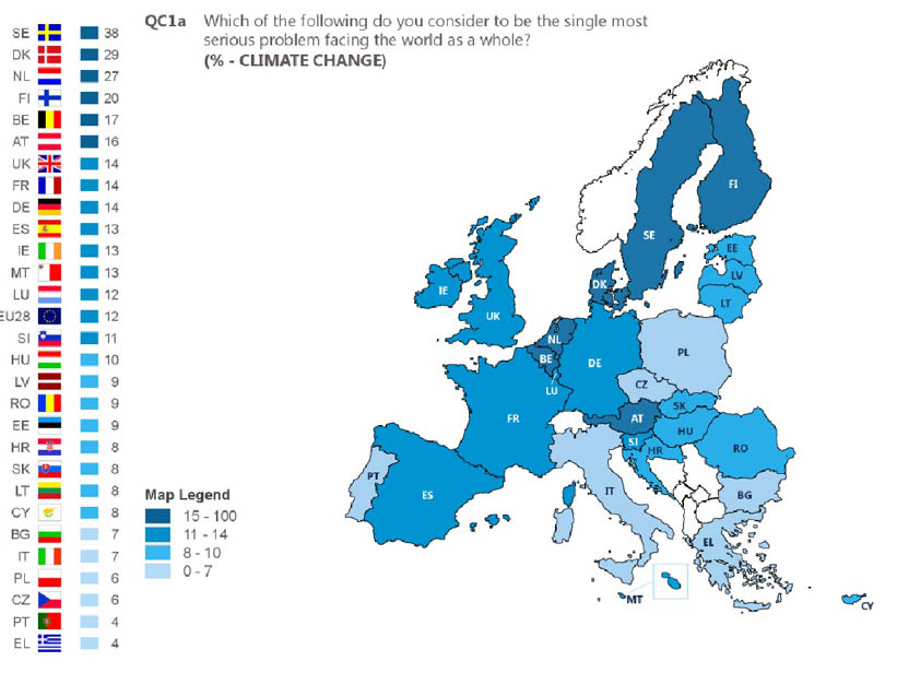 Społeczeństwa europejskie wydają się jednak nie powielać tego mechanizmu. Stan świadomości w kwestii zmian klimatu w UE należy do jednego z najwyższych na świecie. Obywatele państw europejskich uznają zmiany klimatu za trzecie, po ubóstwie oraz międzynarodowym terroryzmie, zagrożenie dla stabilności międzynarodowej.