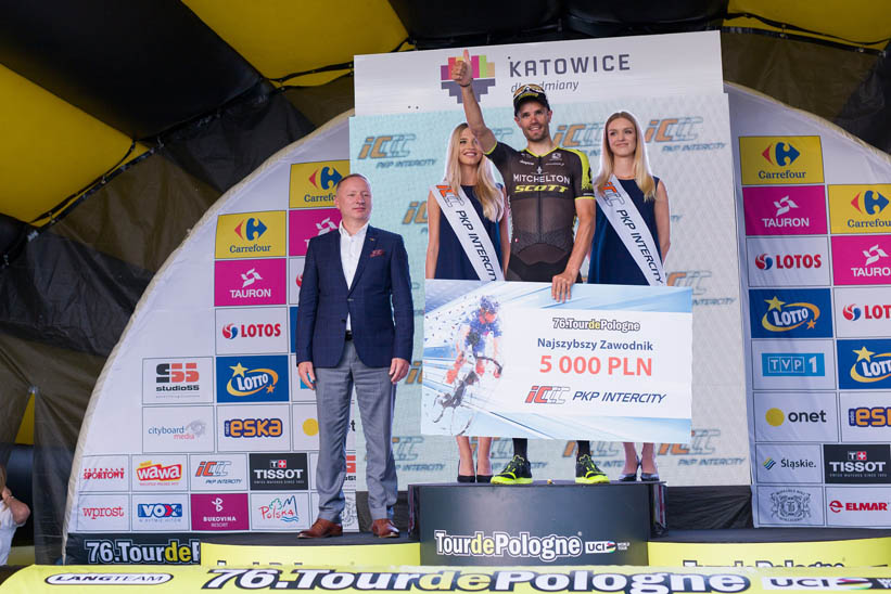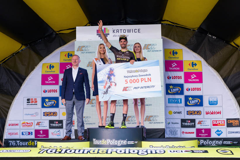 Kolarze rozpoczęli niedzielną rywalizację w Tarnowskich Górach. Stosunkowo płaski jak na Tour de Pologne etap należy do najbardziej widowiskowych. Zwłaszcza dzięki elektryzującemu finiszowi w nazywanych „Świątynią Sprintu” Katowicach. To tam, w okolicach Spodka, zawodnicy rozpędzają się do zawrotnych prędkości, walcząc o miano najszybszego zawodnika rywalizacji. Tytuł najlepszego sprintera otrzymał w tym roku Luka Mezgec z grupy Mitchelton Scott, który uzyskał prędkość 82 km/h. Na mecie czekała na niego specjalna nagroda „Pendolino”, ufundowana przez PKP Intercity.