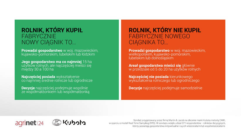 „Wybór odpowiedniej mocy ciągnika jest dla rolnika kluczowy, ponieważ wprost przekłada się na cenę maszyny. Nie ma na przykład konieczności inwestowania w maszynę o mocy powyżej 160 KM, jeśli gospodarstwo, w którym ciągnik rolniczy będzie pracował posiada około 50 ha, ale jest podzielone na kilka mniejszych pól” – wyjaśnia Michał Poźniak, szef sprzedaży maszyn rolniczych Kubota.