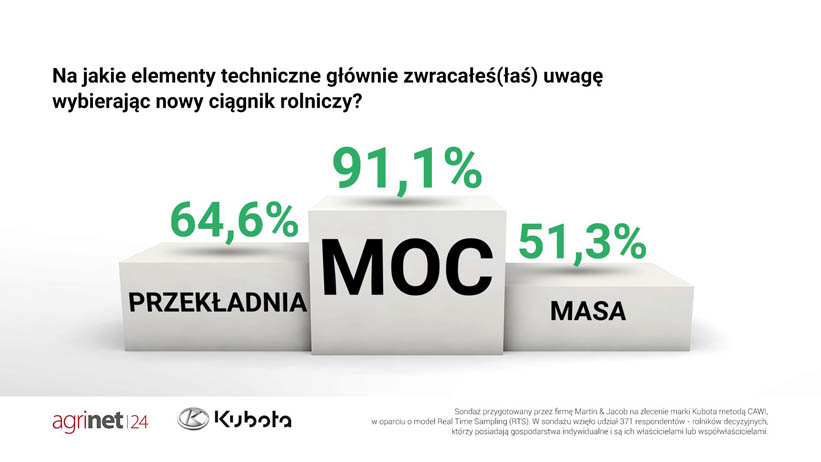 Najważniejszym parametrem technicznym przy zakupie nowego ciągnika jest moc jego silnika. Uważa tak 91,2 proc. rolników, którzy kupili nowy traktor. Polscy gospodarze dużą wagę przywiązują przed zakupem także do bezawaryjności ciągnika (54,7 proc. wskazań) oraz szybkiego dostępu do serwisu i części zamiennych (41,4 proc.). Nie zawsze są jednak z tego serwisu zadowoleni – wynika z sondażu przeprowadzonego na zlecenie marki Kubota przez Martin & Jacob.