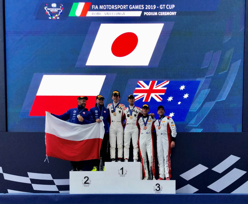 Polacy startowali w Lamborghini Huracán GT3. Dobre wyniki w pierwszym i drugim wyścigu (3. i 4. miejsce) dały im w finale start z pierwszego pola. Ostatecznie, nasi reprezentanci zdobyli srebrny medal w najbardziej prestiżowej klasie Igrzysk Sportów Motorowych FIA. Pierwsze miejsce zajęła Japonia.