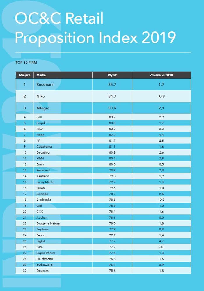 Po rocznej przerwie Rossmann powraca na pozycję lidera rankingu sieci handlowych. Najpopularniejsza sieć drogerii w Polsce cieszy się największym zaufaniem Polaków, zostawia konkurencję daleko w tyle, również w kategoriach takich jak wygląd sklepów, obsługa klientów czy wygoda robienia zakupów. W TOP 10 najlepszych retailerów w kraju znajdują się również: Nike, Allegro, Lidl, Empik, Ikea, 4F, Castorama i Decathlon. Dodatkowo do grona zwycięzców rankingu OC&C Retail Proposition Index bez wahania możemy zaliczyć w tej edycji również firmy wywodzące się z branży e-commerce, tj. Eobuwie.pl oraz Answer.com, którzy dzięki nowemu podejściu do rozumienia strategii omnichannel zaczęły zyskiwać coraz wyższą sympatię polskich konsumentów.