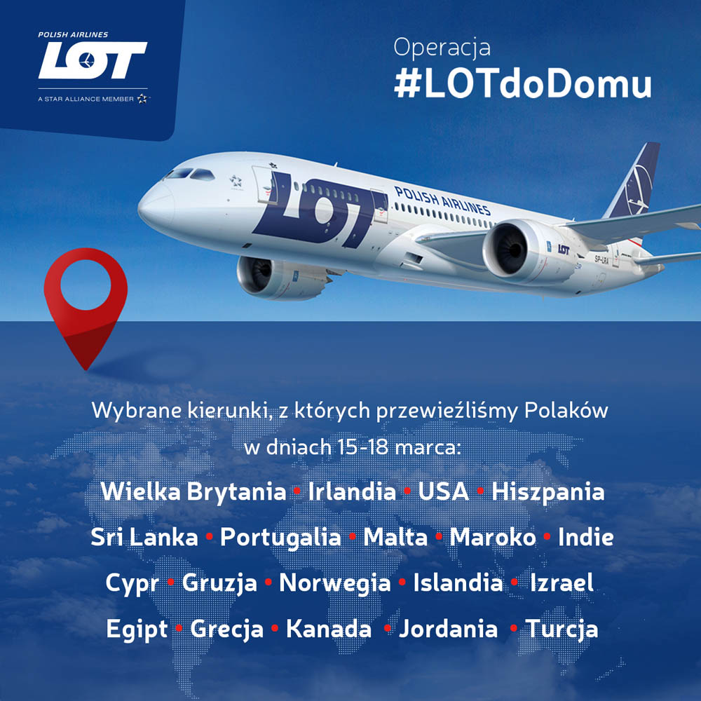 Polskie Linie Lotnicze LOT organizują specjalne loty czarterowe w różne regiony świata, aby zabrać rodaków do domu. Zaplanowane są również dodatkowe rejsy np. z Wielkiej Brytanii, Irlandii, Cypru, Malty oraz Stanów Zjednoczonych w oparciu o szacunki dotyczące liczby Polaków wracających z tych kierunków.