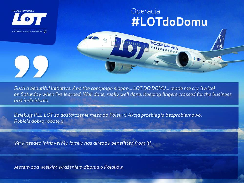„Koncentrujemy wszystkie nasze siły na organizowaniu akcji ratunkowej dla naszych rodaków przebywających poza granicami Polski. Dokładamy wszelkich starań, żeby możliwie szybko sprowadzić do kraju jak największą liczbę Polaków w sytuacji, gdy coraz więcej krajów zamyka granice w obawie przed rozprzestrzenianiem się koronawirusa SARS-CoV-2 – podkreśla Maciej Wilk, członek Zarządu ds. operacyjnych w Polskiej Grupie Lotniczej. – A w wyniku wstrzymania ruchu lotniczego, nawet kilkaset tysięcy Polaków mogło być pozbawionych możliwości powrotu do Polski. Dlatego operacja #LOTdoDomu to projekt wyjątkowy, bezprecedensowy i po raz pierwszy w historii działalności naszych linii lotniczych, prowadzony na taką skalę”.