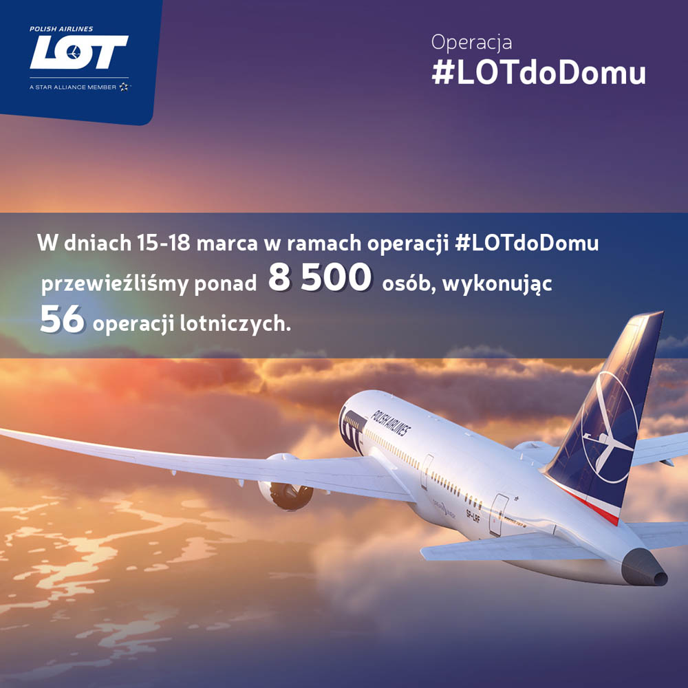 Od 14 marca, kiedy ruszyła operacja #LOTdoDomu, do Polski sprowadzono ponad 8,5 tys. osób, wykonując 56 operacji lotniczych z kilkudziesięciu kierunków z całego świata. W kolejnych dniach planowane są kolejne rejsy ratunkowe, mające na celu sprowadzenie do kraju tych osób, które z powodu koronawirusa i wstrzymania ruchu lotniczego oraz kolejowego nie mogły w normalnym trybie wrócić do domów. To bezprecedensowa w historii polskiego lotnictwa akcja ratunkowa narodowego przewoźnika – PLL LOT.