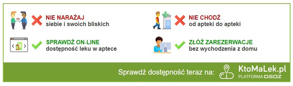 W dobie szerzącej się pandemii koronawirusa specjaliści zalecają – zostańmy w domu. Dobrowolna kwarantanna jest obecnie najskuteczniejszą metodą minimalizowania zakażenia wirusem SARS-CoV-2 oraz ochrony najbardziej zagrożonych obywateli. Co robić, gdy musimy kupić potrzebne leki? Nie chodźmy od apteki do apteki, narażając personel i innych pacjentów na zakażenie. Sprawdzajmy dostępność leków na KtoMaLek.pl i rezerwujmy je z domu.