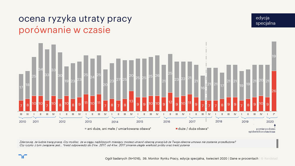 Epidemia COVID-19 spowodowała, że niepewność Polaków o pracę jest najwyższa od 10 lat. Ze specjalnej edycji raportu „Monitor Rynku Pracy” zrealizowanego przez Instytut Badawczy Randstad wynika, że 26% pracowników ryzyko utraty posady ocenia jako duże. To blisko o 1/5 więcej niż przed ogłoszeniem pandemii.