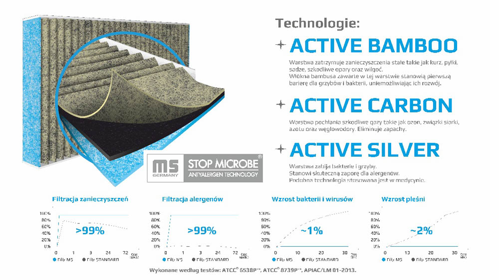 Centrum Badawczo-Rozwojowe grupy MS-Automotive stworzyło innowacyjny filtr kabinowy klasy „Stop-Microbe Antyalergen Technology” z zaporą antywirusową. Chroni on pasażerów przed szkodliwymi substancjami m.in. smogiem, wirusami, pleśniami i bakteriami, a w okresie wiosennym przed licznymi alergiami. Filtr dostępny jest już na Polskim rynku.