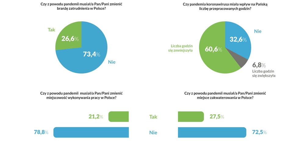 Badanie pokazało, że pracowników zagranicznych w Polsce dotknęły negatywne skutki pandemii koronawirusa. Ponad połowa z zatrudnionych obcokrajowców musiała zmierzyć się ze zmniejszeniem liczby przepracowanych godzin (61%), a przeszło 1/4 zmieniła branżę zatrudnienia (27%). Ponadto co drugi respondent oświadczył, że w obecnej sytuacji najbardziej obawia się utraty pracy (58%). Dla porównania - zakażenia koronawirusem boi się jedynie co szósty migrant zarobkowy (18%).