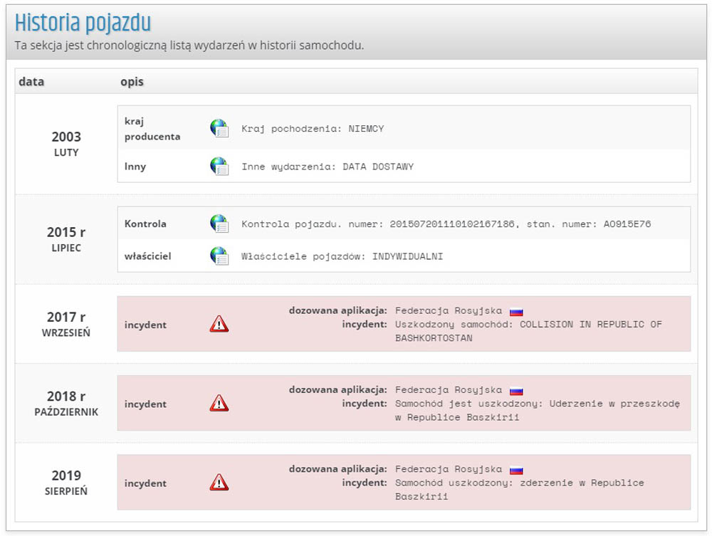 W raportach autobaza.pl znajdziemy również wartościowe dane o pojazdach z Rosji. Prześledzimy historię pojazdu i uzyskamy informacje o ewentualnych szkodach, które miały miejsce za naszą wschodnią granicą.