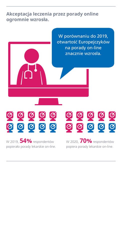 W porównaniu z rokiem ubiegłym, odsetek Polaków skłonnych do odbywania konsultacji online w ostatnim roku wzrósł w o 16 punktów procentowych: z 58 proc. w 2019 roku do 74 proc. w 2020 roku. W porównaniu do uzyskanej w badaniu średniej stawia to Polskę na 5. miejscu w kwestii gotowości do korzystania z teleporad medycznych. Oznacza to, że jedynie 8 proc. badanych uznało za osobistą interakcję z lekarzem za szczególnie istotną – poniżej średniej europejskiej, która w tym roku wyniosła 11 proc. Badaniem objęto przeszło 24 tys. respondentów z 12 krajów Europy, w tym Niemcy, Wielka Brytania, Francja, Hiszpania, Włochy, Belgia, Polska, Austria, Szwajcaria, Finlandia, Serbia i Rosja.