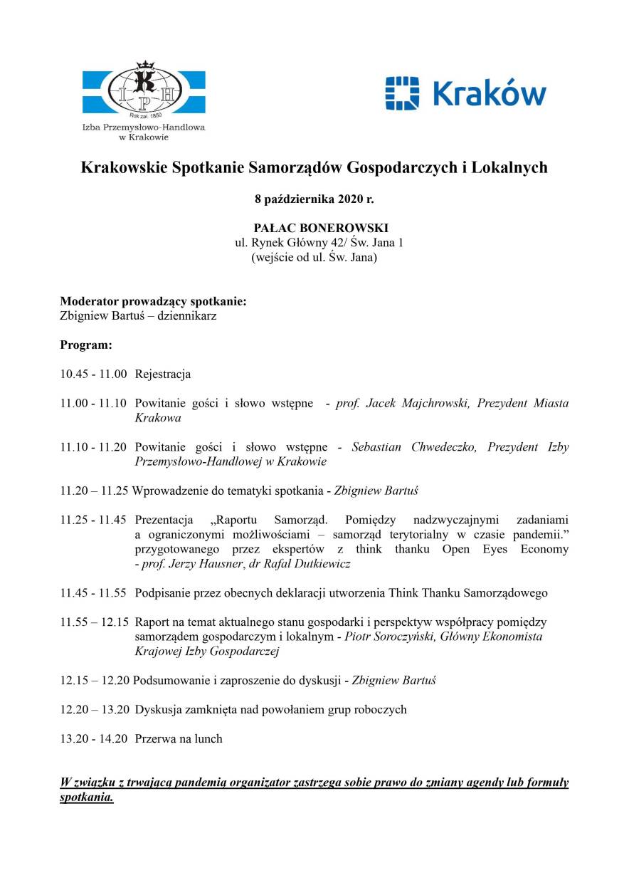Krakowskie Spotkanie Samorządów Gospodarczych i Lokalnych 8 października 2020