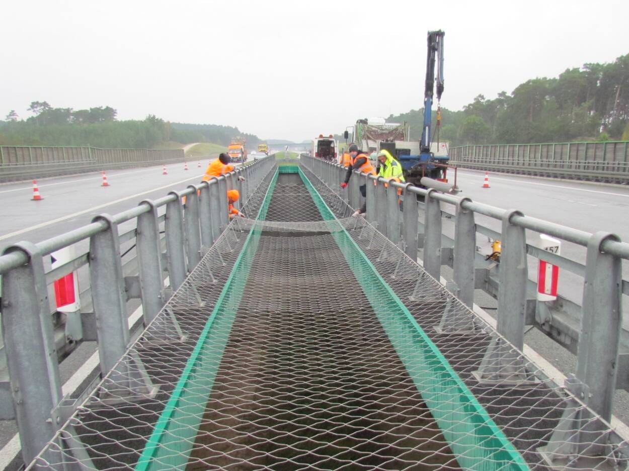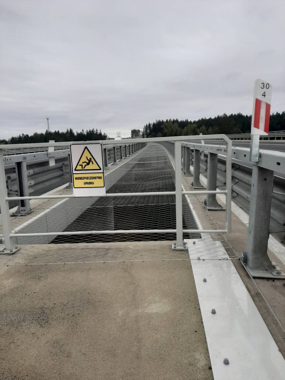Zgodnie z obowiązującymi przepisami na obiektach inżynierskich montowane są, wyższe od zwykłych, bariery zabezpieczające przed zjechaniem pojazdu poza krawędź obiektu oraz przed upadkiem człowieka z wysokości. Idziemy o krok dalej i zabezpieczamy przestrzeń między obiektami mostowymi, po których przebiegają jezdnie jednej trasy. Pierwsze siatki zabezpieczające już zamontowano.