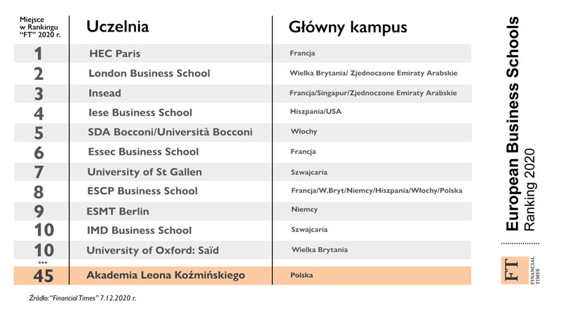 „Financial Times” opublikował ranking 90 najlepszych uczelni biznesowych w Europie. Jedyną polską uczelnią w tym rankingu, a równocześnie pierwszą wśród szkół z regionu Europy Środkowo-Wschodniej jest Akademia Leona Koźmińskiego (Kozminski University), która znalazła się na 45. Miejscu, awansując o trzy pozycje w porównaniu z ubiegłym rokiem.