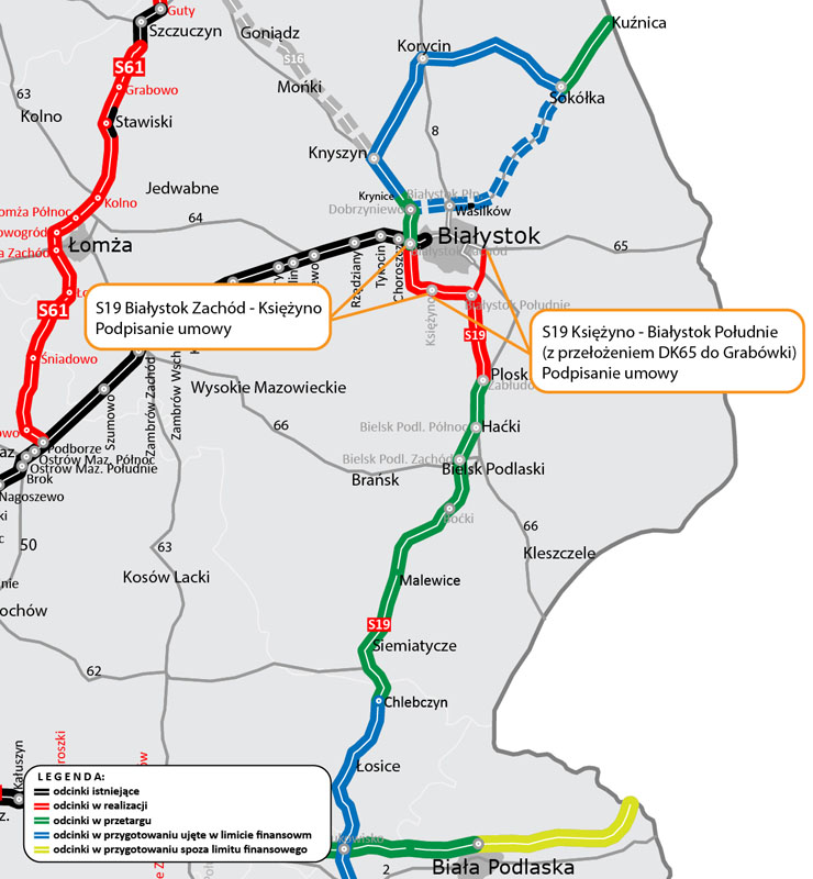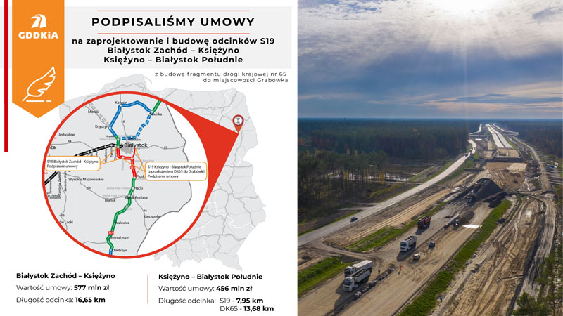 Wykonawcy, firmy Budimex i Aldesa, mają zrealizować łącznie 24,5 kilometra drogi ekspresowej S19 pomiędzy węzłami Białystok Zachód i Białystok Południe oraz 13,68 km nowego przebiegu DK65 w standardzie GP (ruchu głównego przyspieszonego).