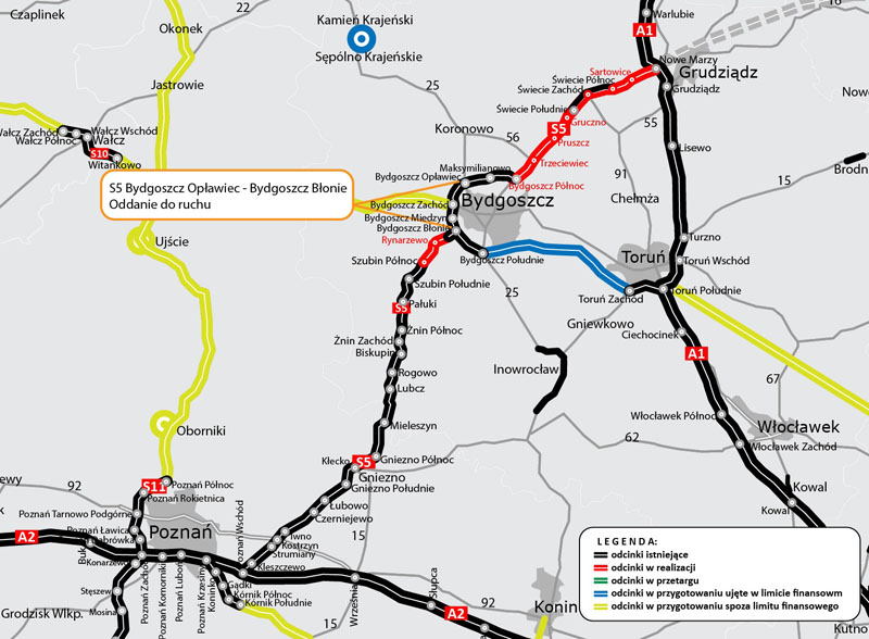 Bydgoszcz była dotychczas miastem szczególnie obciążonym ruchem tranzytowym, na który nakładał się ruch lokalny. Oddając zachodnią część obejścia miasta, łączymy w całość obwodnicę Bydgoszczy, która wyprowadza ruch tranzytowy z centrum, szczególnie relacji Poznań - Gdańsk. Ósme co do wielkości miasto w Polsce, dzięki inwestycjom na sieci dróg krajowych, będzie mogło jeszcze bardziej wykorzystać swoją lokalizację rozwijając infrastrukturę logistyczną. Droga ekspresowa S5 zbliża Bydgoszcz do autostrady A1, a w stronę Wielkopolski do autostrady A2.