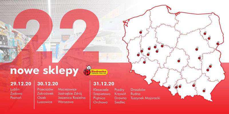 Nikogo nie trzeba przekonywać, że mijający 2020 rok był szczególnie trudny. Dla wszystkich. Sieć Biedronka, chcąc być jeszcze bliżej swoich klientów, zapewniając komfortowe i bezpieczne codzienne zakupy, otwiera nowe sklepy. Także w miejscowościach, gdzie sieć dotąd nie była obecna. Do 31 grudnia na mapie Polski pojawią się 22 kolejne placówki, które stale będą oferować atrakcyjne promocje.