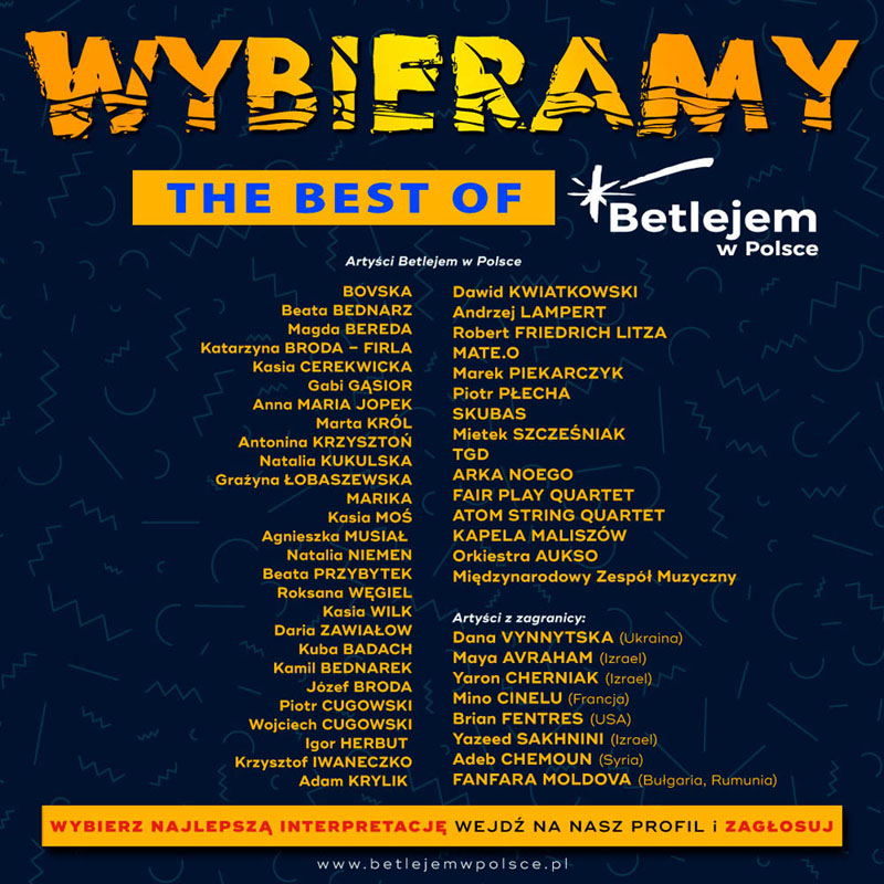 Zapraszamy zatem państwa do dokonania wyboru. Prosimy posłuchajcie, obejrzyjcie i wybierzcie państwo która z dotychczasowych interpretacji kolęd jest najbliższa waszym gustom, a przede wszystkim – waszemu sercu. Która kolęda w wykonaniu tak licznych artystów „Betlejem w Polsce”, poruszyła szczególnie struny państwa wrażliwości? Czy ta śpiewana przez Annę Marię Jopek lub wykonywana przez Kubę Badacha albo Igora Herbuta, a może te utwór który śpiewał Mietek Szcześniak? Naprawdę jest z czego wybierać!
