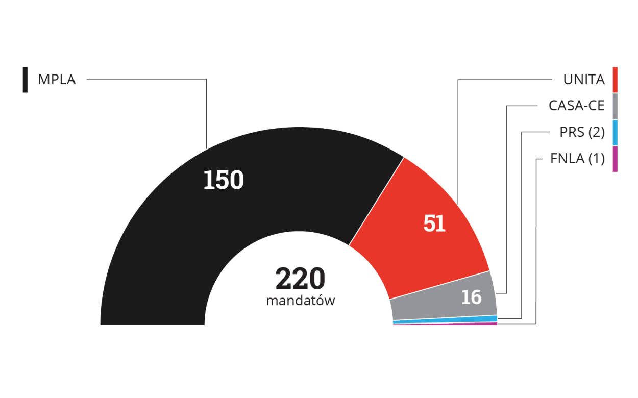 Podział mandatów po wyborach z 23 sierpnia 2017 r.: MPLA 150, UNITA 51, CASA-CE 16, PRS 2, FNLA 1. Razem 220.