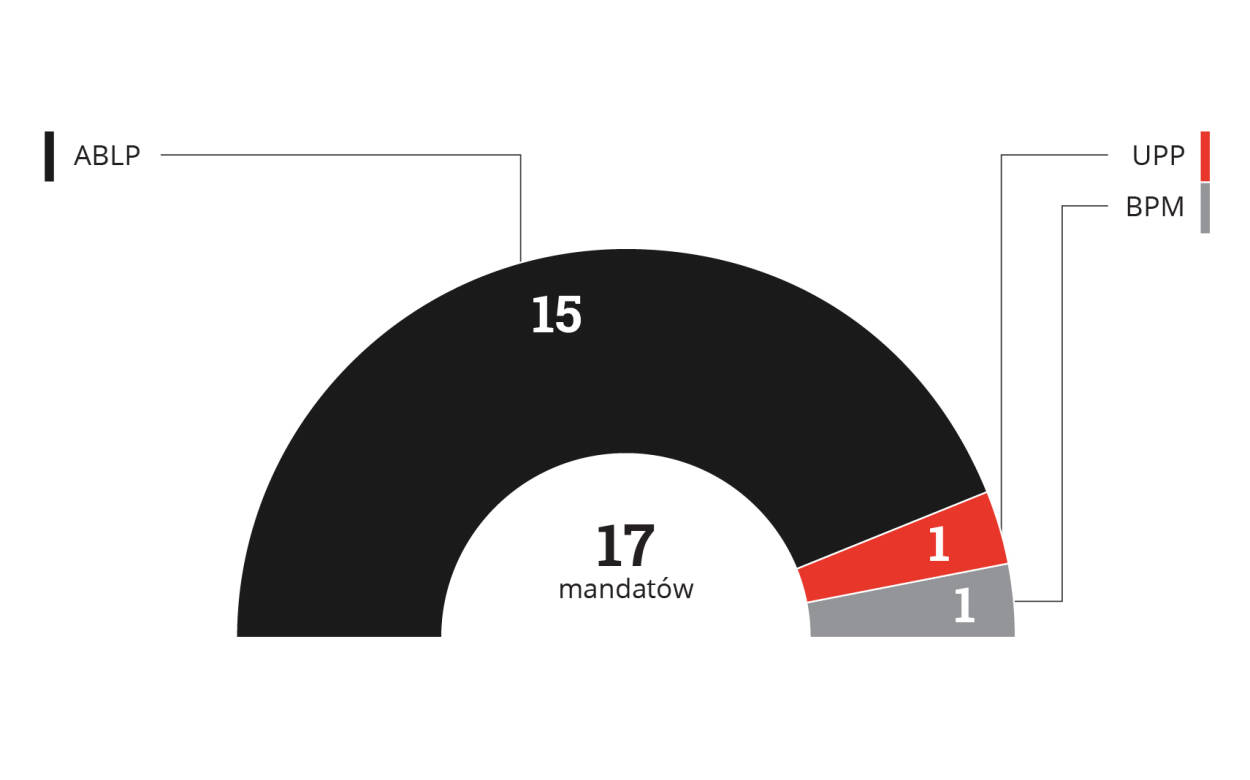 Podział mandatów po wyborach do Izby Reprezentantów z 21 marca 2018 r.: ABLP 15, UPP 1, BPM 1. Razem 17.