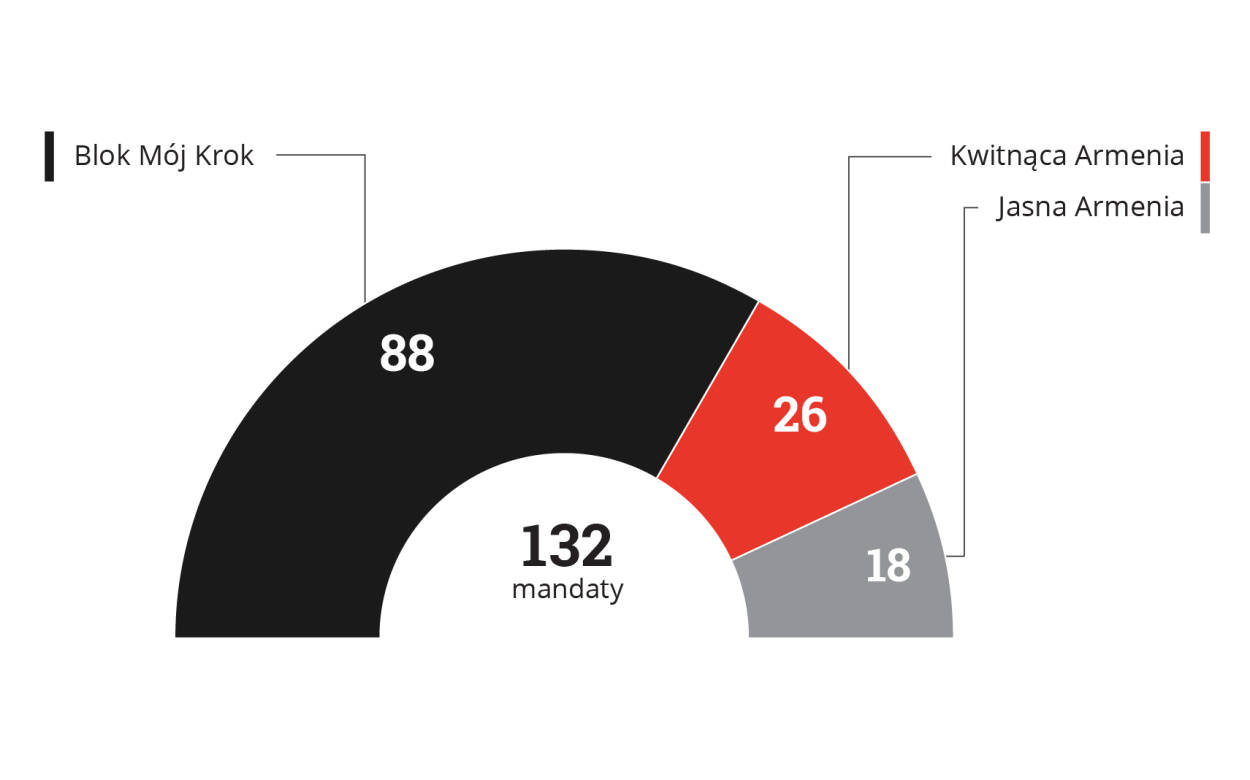 Podział mandatów po wyborach z 9 grudnia 2018 r.: Blok Mój Krok 88, Kwitnąca Armenia 26, Jasna Armenia 18. Razem 132.