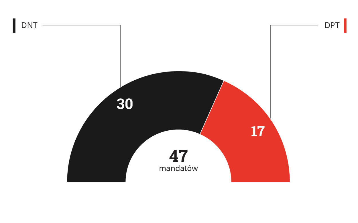 Podział mandatów w Zgromadzeniu Narodowym po wyborach z 15 września i 18 października 2018 r.: DNT 30, DPT 17. Razem 47.