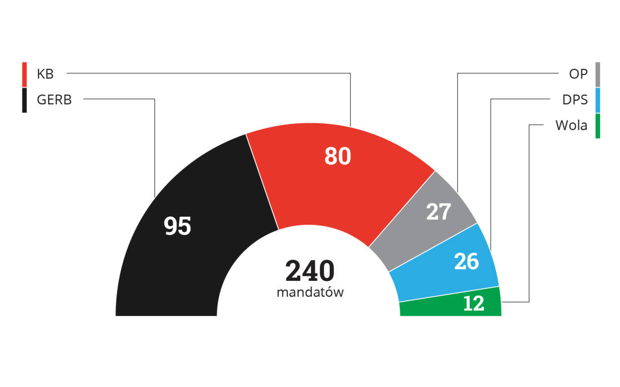 Podział mandatów po wyborach z 26 marca 2017 r.: GERB 95, KB 80, OP 27, DPS 26, Wola 12. Razem 240.