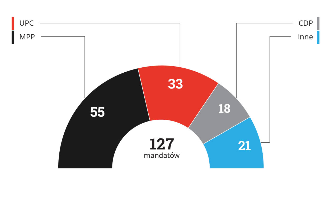 Podział mandatów po wyborach z 29 listopada 2015 r.: MPP 55, UPC 33, CDP 18, inne 21. Razem 127.