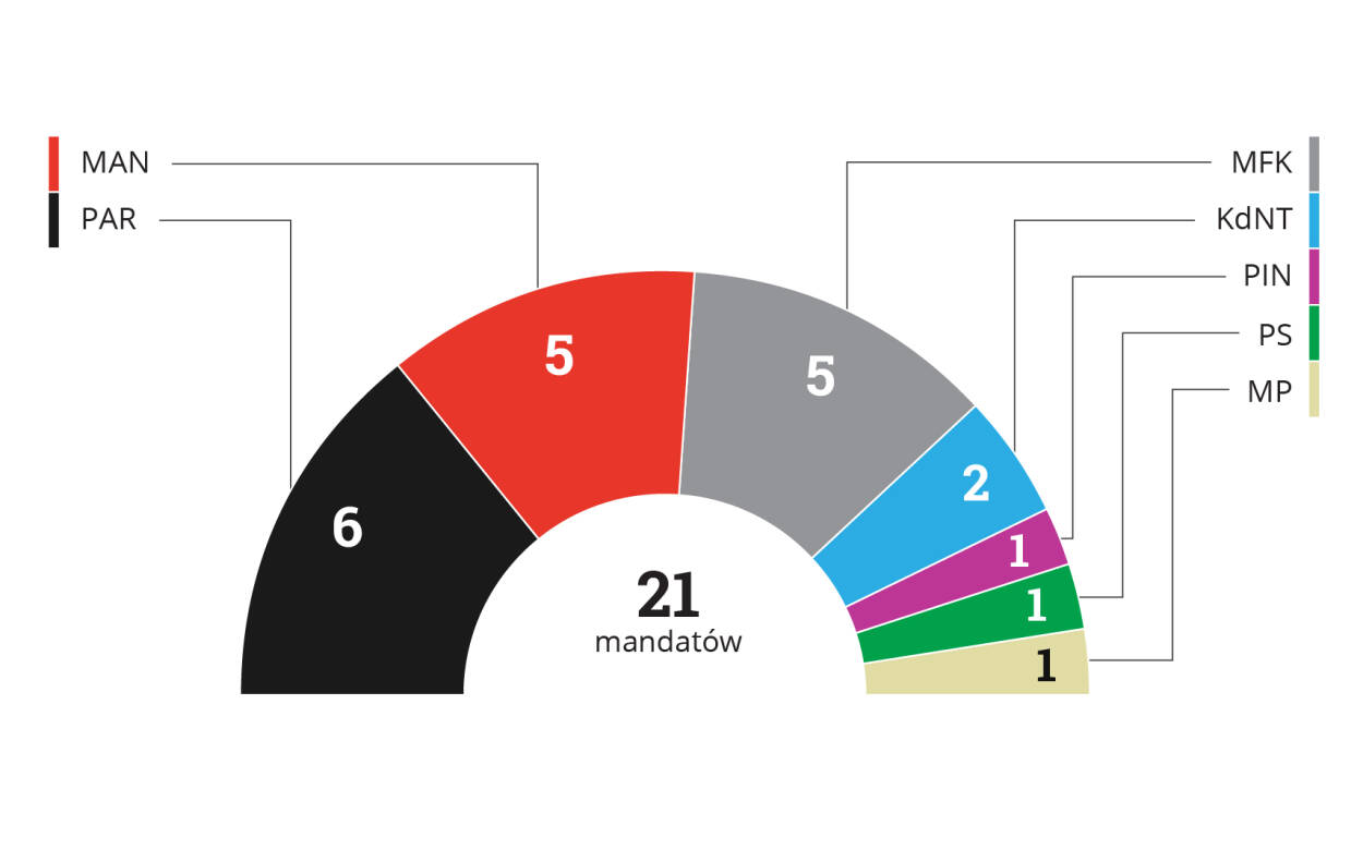 Podział mandatów po wyborach z 28 kwietnia 2017 r.: PAR 6, MAN 5, MFK 5, KdNT 2, PIN 1, PS 1, MP 1. Razem 21.