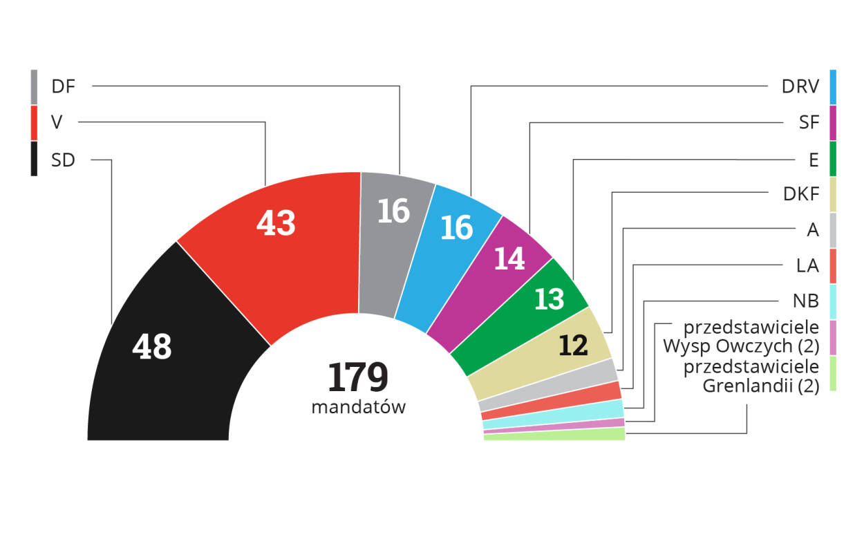 Podział mandatów po wyborach z 5 czerwca 2019 r.: SD 48, V 43, DF 16, DRV 16, SF 14, E 13, DKF 12, A 5, LA 4, NB 4, przedstawiciele Wysp Owczych 2, przedstawiciele Grenlandii 2. Razem 179.