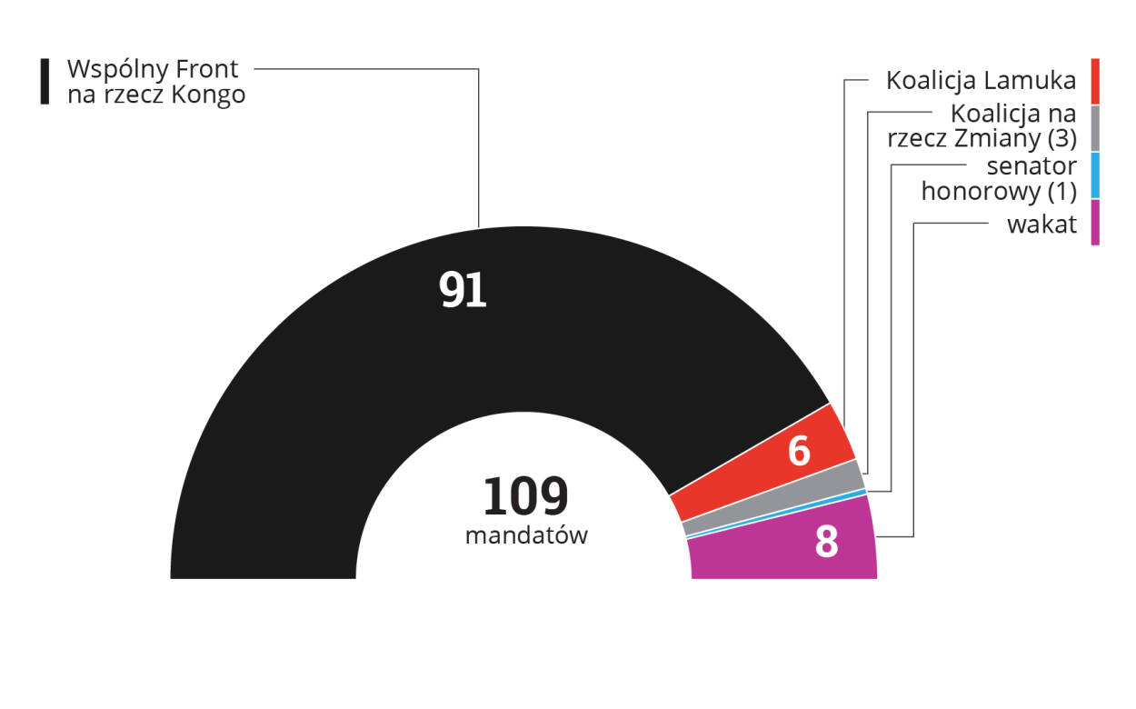 Podział mandatów po wyborach z 14 marca 2019 r.: Wspólny Front na rzecz Kongo 91, Koalicja Lamuka 6, Koalicja na rzecz Zmiany 3, senator honorowy 1, wakat 8. Razem 109.