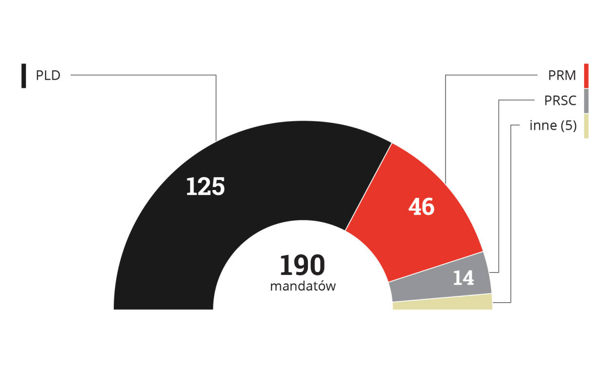 Podział mandatów po wyborach z 15 maja 2016 r.: PLD 125, PRM 46, PRSC 14, inne 5. Razem 190.