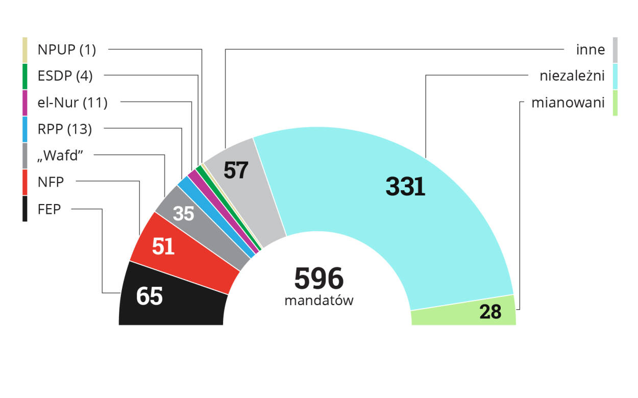 Podział mandatów po wyborach, które odbyły się w kilku turach od 17 października 2015 r. do 2 grudnia 2015 r.: FEP 65, NFP 51, "Wafd" 35, RPP 13, el-Nur 11, ESDP 4, NPUP 1, inne 57, niezależni 331, mianowani 28. Razem 596.