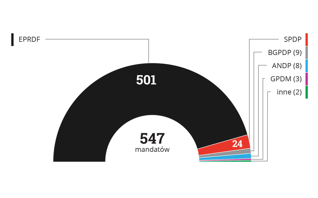 Podział mandatów po wyborach z z 24 maja 2015 r.: EPRDF 501, SPDP 24, BGPDP 9, ANDP 8, GPDM 3, inne 2. Razem 547.