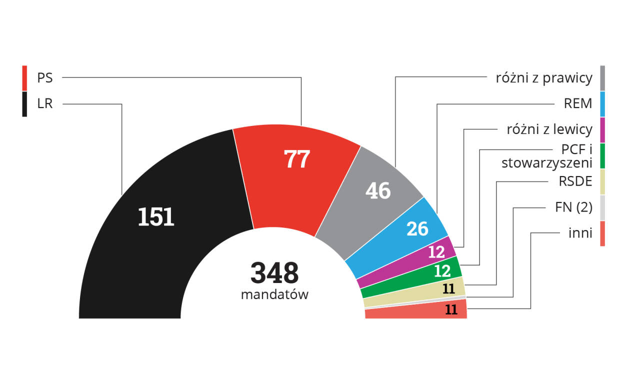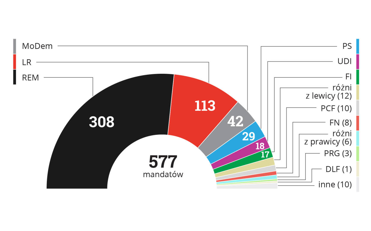 Podział mandatów po wyborach z 11 i 18 czerwca 2017 r.: REM 308, LR 113, MoDem 42, PS 29, UDI 18, FI 17, różni z lewicy 12, PCF 10, FN 8, różni z prawicy 6, PRG 3, DLF 1, inne 10. Razem 577.