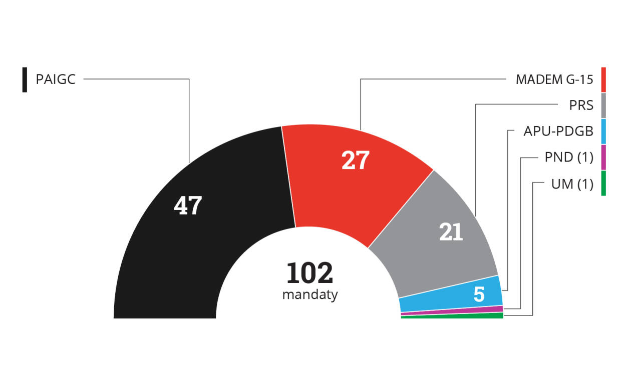 Podział mandatów po wyborach z 10 marca 2019 r.: PAIGC 47, MADEM G-15 27, PRS 21, APU-PDGB 5, PND 1, UM 1. Razem 102.
