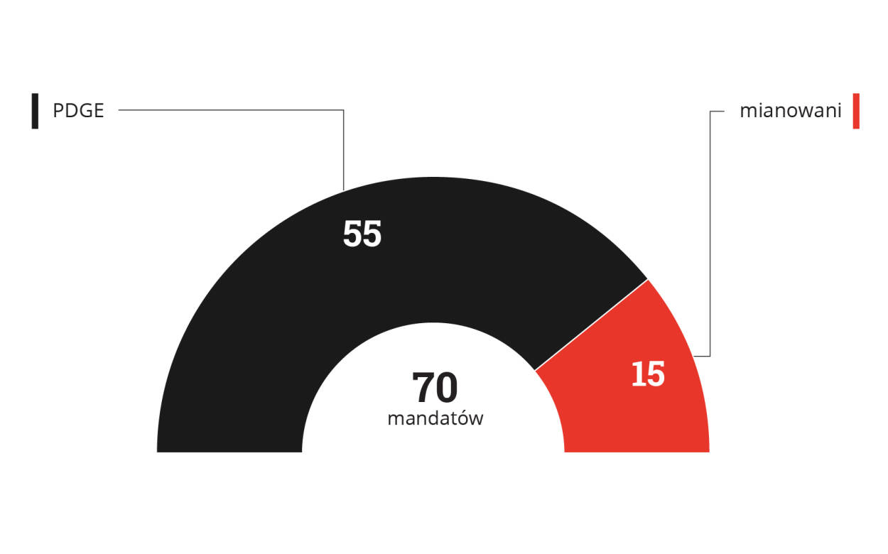 Podział mandatów po wyborach z 12 listopada 2017 r.: PDGE 55, mianowani 15. Razem 70.
